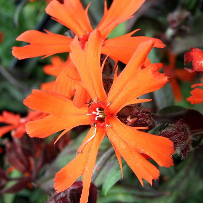 - Le lychnis arkwrightii caractérisé par une floraison de couleur orange avec un feuillage sombre
